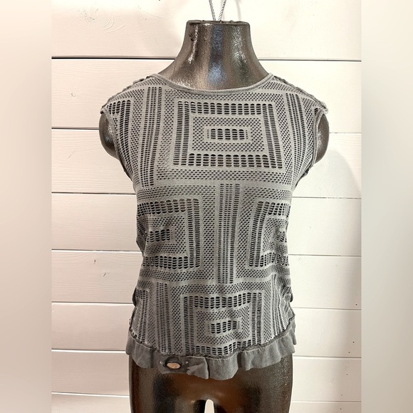 Elegant sleeveless top by Elisa Cavaletti in sheer grey crochet knit with geometric design. Ruffled hem adds a feminine touch. No size tag, fits Small (S). Stretchy fabric.