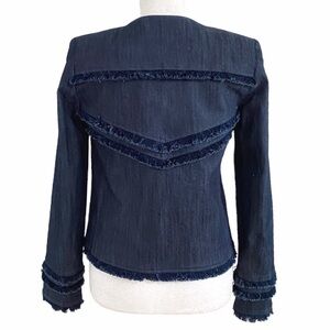 ELIZABETH AND JAMES DARK WASH DENIM FRINGE COLLARLESS JACKET, this is a mix of a urban modern and western jacket in a dark wash denim featuring fringe on the upper fron shoulder - layered cuffs - on welt pockets trim (usable) and in a v-shape in the back for the country / western touch - open jacket- colarless - lined - not stretch - very structured - not cropped yet short in length, regular thick shoulder pads, minimalist with a twist, perfect transitory jacket for spring and fall for a layered look with ankle boots and a jeans for a double denim trendy outfit or track pants for a chic streetwear style. Versatile - original and stylish.