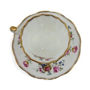 Crafted with delicate precision, this Elizabethan fine bone china teacup and saucer showcase an elegant floral pattern of pink and blue hues enhanced by gold trim.