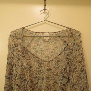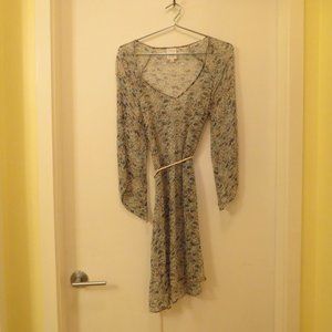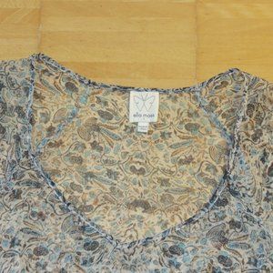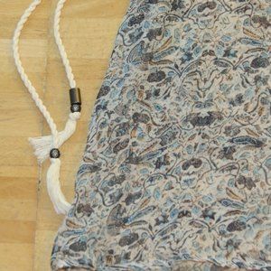 This beautiful floral-print tunic by ELLA MOSS is made of 100% silk. Worn only a couple of times-- no visible flaws. Rope belt is included-- it comes adorned with two silver-coloured beads, and threads through two delicate belt loops (one on either side of tunic). Material is semi-sheer. Marked as size S. Actual measurements are: bust: 36", length- 36". Comes from a smoke-free and pet-free home.
