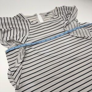 Elle white top with thin black stripes. It has flowy flutter butterfly sleeves and a form fitting bodice. It would remind you of a wide strapped tank top underneath then the flowy long arms on top of that. Makes it a cool breezy top for the summer. This shirt is stretchy and comfy. There is an accent keyhole on the back that buttons up. Such a cute fun and flirty top for the summer or the office. In excellent used condition with no flaws. Please see photos for measurements and details. Women's size MEDIUM.