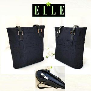 ELLE Paris Classic Tote Bag Features Dark Blue Monogram Thick Quality Nylon Shoulder Grab Bag Purse, North/South Shape Tote Bag, Exterior Front Velcro Pocket, Black Genuine Leather Dual Flat Handles w/ Silver-tone Buckles, Top Zipper Closure. Fully Lined. Medium size bag purse, perfect size for daily use!