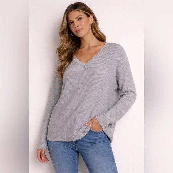 Keywords: ribbed sweater, V-neck knit, grey pullover, soft modal blend, minimalist staple