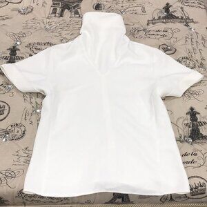 Ellery short-sleeved top in ivory, turtleneck collar, rolled up sleeves, back zip closure, straight/finished hem, tonal stitching.