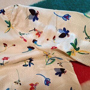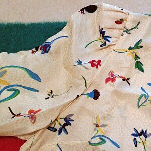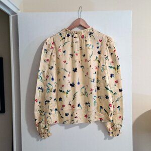 In like-new condition, this is a made in Canada blouse with a silky feel, size medium and fits someone who is a size 6 to 8. Blouse might actually be silk, but I'm not completely sure since I cut the material tag out because it itched. Elastic ruffled neckline and cuffs, straight fit perfect for tucking. Shoulders have thin padding for some structure. Measures 21 inches pit to pit, 22 inches at the hip, 24 inch length, 18 inch sleeves. Pale yellow with a mottled dot pattern and colourful flowers.