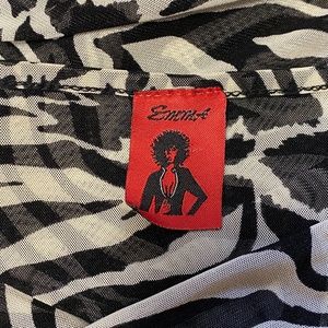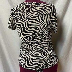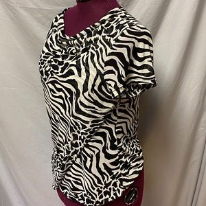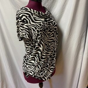 - Front wrap - Semi sheer - Zebra print - Cowl neck - Short sleeve Size tag missing. Approx M