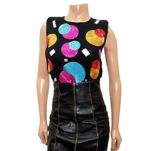 Jazz up any outfits with this sunshine-of-a-ray sequins, sparkly Emporio Armani top. Top features an array of circle and rectangular sequins in the most vibrant gemstone hues. Oh, and can we just say how much we're adore the shoulder pads? So on trend. This beauty isn't just a looker, she feels amazing...super soft luxuriously fabric.