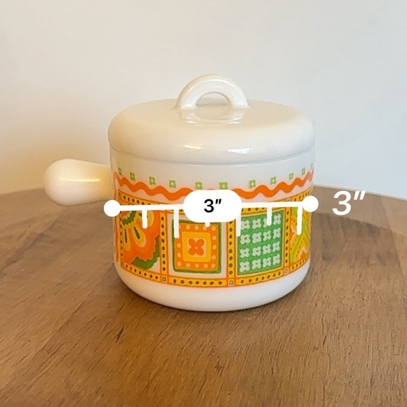Fabulous vintage milk glass EMPTY candle bowl from Avon. The lid is included. This item is in great used condition with no chips, cracks or scratches. The candle, that came inside of the bowl has been burnt and the bowl is EMPTY. This gorgeous dish can be used for keys, trinkets, jewelry, spices, craft storage, cotton balls/cue tips/hair supplies or you could even insert another candle into the dish. The patchwork pattern around the outside of the dish is made in an orange and lime green colour. Approximate measurements have been included in the attached photos.