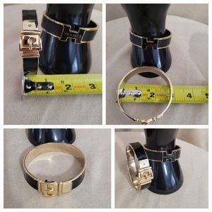 Stunning BUCKLE black / gold enameled bangle to wear solo or layer / see dimensions for width and circumfrance / Has a very Kenneth Jay Lane Look to it / shown with H bangle for size comparison ONLY