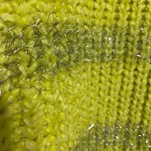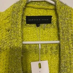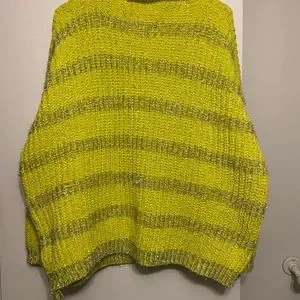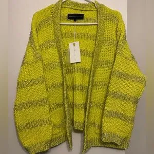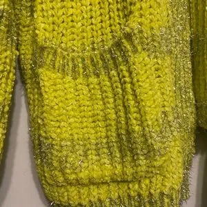 No collar or closure, soft knit with tinsel stripes. Slightly oversized with drop shoulder.