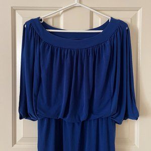 In excellent condition lined Enfocus Studio royal blue dress. Drapes beautifully and fits comfortably. Pullover style. Slits on the sleeves creates flow.