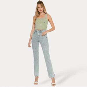 Stylish light green knit tank top by English Factory. Features charming floral embroidery, ribbed trim, square neckline and a soft feel.