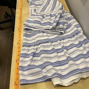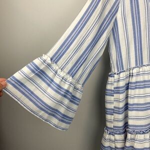 The Boardwalk dress is ready for some fun in the sun. This beachy dress has a mandarin V-neck, gorgeous blue colors, and ruffle details on the sleeve and body. The bell sleeve and relaxed fit make this a perfect dress for sunhats and flip flops or baseball caps and sneakers. Throw it on over some distressed jeans for a take me into fall look.