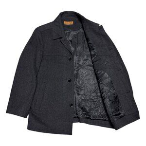 Sized as a men's XL (44R), this coat features a classic button closure and practical pockets, making it an ideal choice for travel or everyday wear. The coat's solid pattern and regular fit cater to a sharp, tailored look, while the added insulation of wool ensures you stay cozy through the changing seasons of fall, spring, and winter.