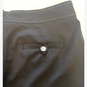Black in color with white stitching at waist and front pockets. The pants have a back pocket that buttons and double button and zipper closure.