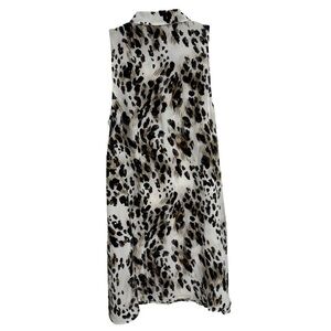 100% silk leopard print sleeveless shirt dress by Equipment Femme. It features a collared neckline, button front, and a relaxed silhouette that can be styled as a dress or worn open as a longline top.