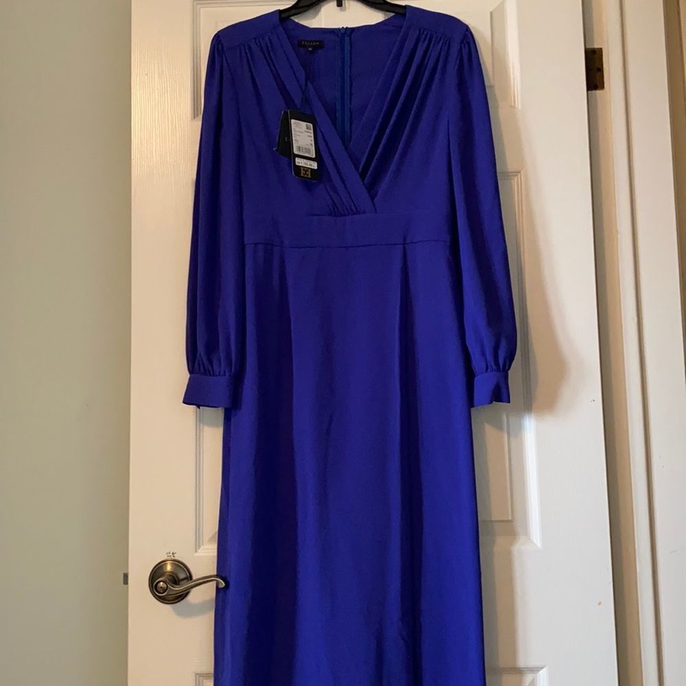 ESCADA DRESS long sleeve midi unlined concealed zipper at the back faux wrap color dark cobalt