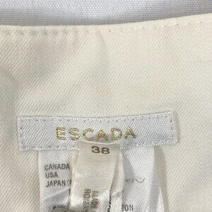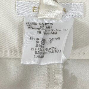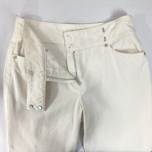 ESCADA IVORY WHITE HIGH RISE STRAIGHT LEG STITCHED LOGO FRONT PANEL CLOSURE JEANS, This is a sleek old money contemporary ivory white straight leg high rise / high waist jeans from ESCADA featuring an interesting stitched logo fron panel closure at waistline with 2 hook & barre and 2 button fastening for an extra safe fastening - zipper fly - no belt loop for clean chic sleek style - super stretch and comfy, wearable all year long from spring to winter for a casual to a business casual look. Versatile.