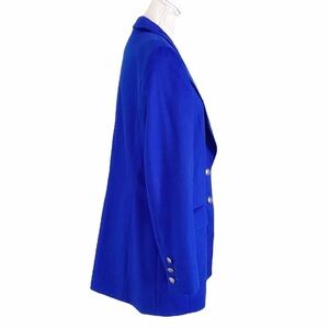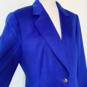 ESCADA MARGARETHA LEY VINTAGE RABBIT NEW WOOL ROYAL BLUE LONG BLAZER JACKET, 1990'S ESCADA MARGARETHA LEY ROYAL BLUE BLAZER RABBIT FUR WOOL BLEND JACKET DEADSTOCK, This beautiful yellow Escada blazer is deadstock, The jacket was designed by Margaretha Ley in the early 1990's. It is extremely soft, with a 70% Rabbit and 30% new wool blend and rayon logo lining. There is an inner label that reads: Piacenza orylactus exclusively for Escada Margaretha Ley Made in Italy. Notched lapel collar - lined - silver metallic engraved button front closure - long sleeve with 3 button details at cuffs - long length - Flap pockets - not stretch yet slightly relaxed / boyfriend yet super sleek, crisp, sophisticated, classy, chic, upper class blazer which is extremely soft with the rabbit fabric. PErfect business to formal blazer for work / workwear / career / business / office or any vintage feel formal yet trendy look with black leggings and a loose fit blouse.