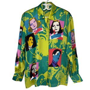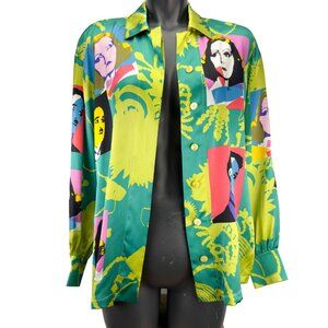 This is by far the most amazing silk shirt by Escada from the designer Margaretha Ley. Famous celebrity print. Bursting with vibrant hues and bold graphic prints, this piece captures the essence of the era's artistic rebellion. It epitomises the fusion of fashion and culture, celebrating the timeless allure of two legendary figures through a contemporary lens.