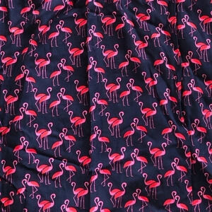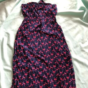 Gorgeous maxi dress with flamingo pattern. Strapless with ruffle detail across the breast area. Elastic to hold it up as well. Very soft, 100% Rayon. Made in Indonesia. Size on the tag is medium, please see photos for measurements. This dress is adorable for the upcoming summer season!