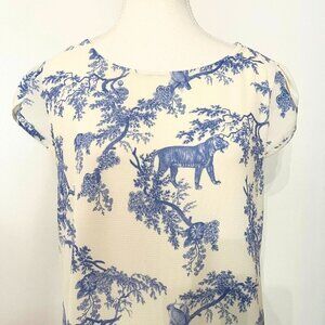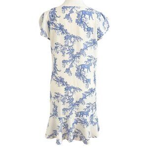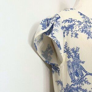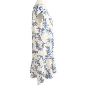 ESPECIA WHITE BLUE TIGER ASIAN GARDEN TULIP CAP SLEEVE RUFFLE SHIFT DRESS - M