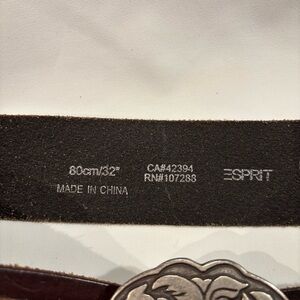ESPRIT Sz 32” or 80 cm Brown Leather Belt with Metal Floral Style Ornate Buckle Stylish brown leather belt featuring an ornate silver buckle. Perfect for adding a touch of elegance to any outfit. Festival, Western, rodeo, bohemian vibes.
