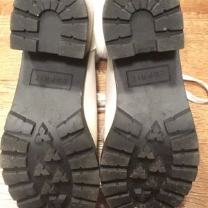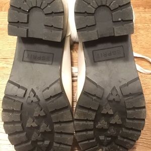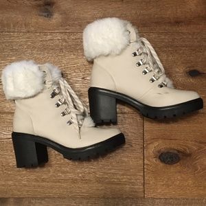 Cute pair of ESPRIT ankle boots. Off-white body. White faux fur lines the ankles and tongue. Laces with chunky heel. Worn only a few times with only a few minor scuff marks.