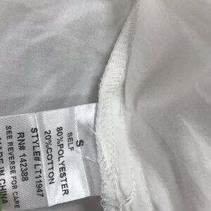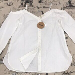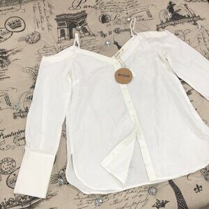 Solid white button-down top with cold-shoulder cut-out on long sleeves.