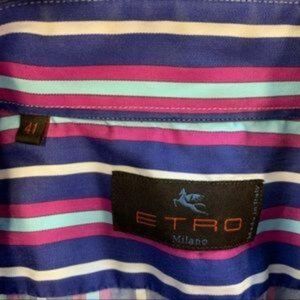 Men’s Etro Blue purple pinstripe dress shirt size 41. Excellent condition. Never worn. 100% cotton. Made in Italy. $250 new. Measurements available upon request