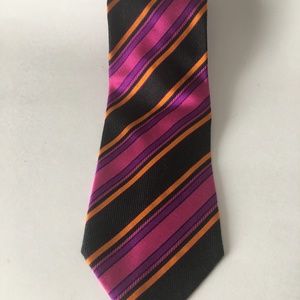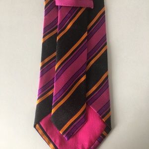Beautiful gently used ETRO Milano Italy Striking Vibrant Pink Purple Orange Black Striped Neck Tie. Made from 100% Pure Silk and woven in Italy. Luxury Quality tie ! Tie measures 59 1/2" long with the widest part of the tipping measuring 3 3/4" wide.