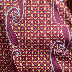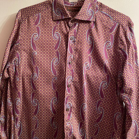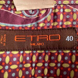 ETRO long-sleeve dress shirt with striking pattern and button cuffs. Dot and dash design in green, blue, and red with Purple base colour. Long in torso.