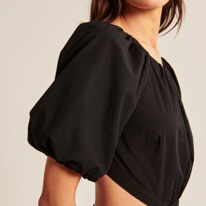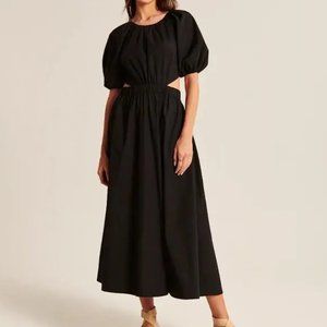 Black, Size Large PETITE Flattering short-sleeve midi dress in a soft poplin fabric with on-trend puff sleeves, open-back detail with scrunchie straps, volume skirt and high neck