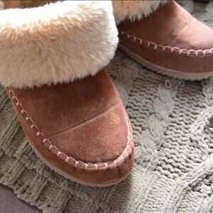 Excellent worn condition Rubber-soled Wool blend Dearfoam slippers/ankle boots - indoor/outdoor, skid-resistant. Caramel brown with cream fur trim. Contoured insole with arch support. These are very lightly worn (please see photos for bend-crease) - very comfortable, but fit small (a very snug size 6) which is why I'm selling them. This colour retails for $98 on Amazon. Please see all photos for details. Sold as-is. All reasonable offers welcome!