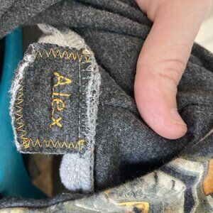 Tag says “Alex” (but you could cut the tag out if it bothered you). Gently worn and washed, I don’t see any holes or stains.