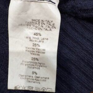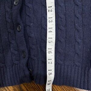 This is a super classic and the staple cable knit cardigan. It is made of wool, viscose, and cashmere (see label). It has been worn only a few times.