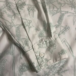Lovely lightweight white fabric with subtle check texture and light sage green nature designs.