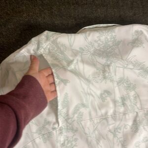 Lovely lightweight white fabric with subtle check texture and light sage green nature designs.