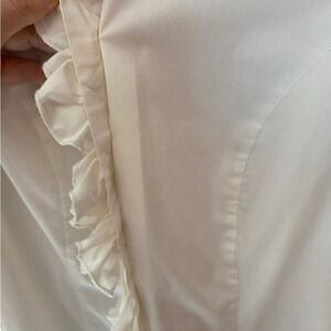 Ruffles all over. Nice andnlomgnso can easily be worn untucked and still look appropriate for work. Works really well if you are long-waisted. Also looks great with a pair of jeans. Machine washable.