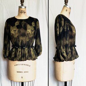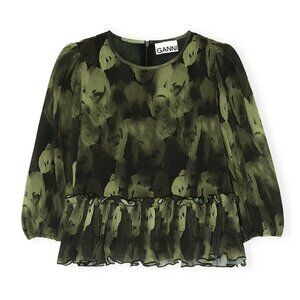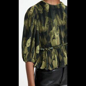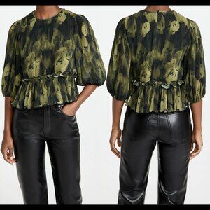 EUC GANNI Pleated Georgette Blouse in Olive Green Floral 38 6 Small