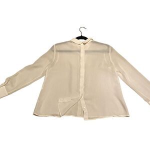 This blouse is perfect to dress up your outfit. It’s really eye catching. It’s sheer with heaving cloth around the wrists, which have covered buttons. Buttons up the back. Looks great under a blazer with the collar out.