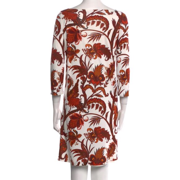Gucci Shift Dress by Frida Giannini in a baroque-inspired floral motif with elaborate and intricate designs in red, orange, and brown tones against a white background.