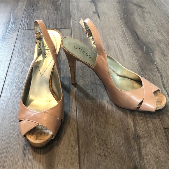 EUC Guess size 8 heels 3.5” cork covered heels Leather upper Cork, leather-covered footbed Man-made sole Smoke-free home