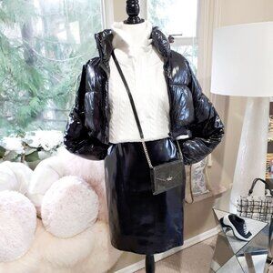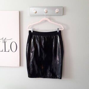 EUC H&M black faux leather patent shine effect-like front & fabric back skirt, M