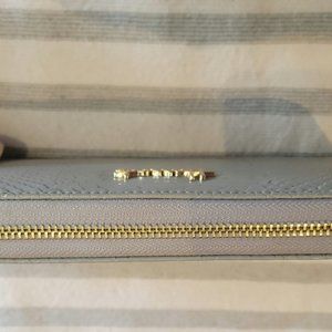 Euc, Harrods gray faux croc embossed vegan full zip wallet with 8 interior slip pockets for credit cards, 2 billfold pockets and 1 interior zip pocket.