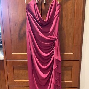 Excellent condition Katie May “So Juicy” dress in shade pink peacock, size small, fit is true to size and best for US size 2 - 4. Dress is a fitted sheath silhouette in a floor skimming length, with adjustable halter straps and low cut cowled back. Other features include cowl draped top, rushed stomach detailing, and high cut thigh slit with draped hip detailing. Straps feature discrete, delicate silver hardware and the garment is fully lined to add light support, lifting, and contouring.