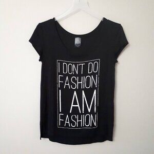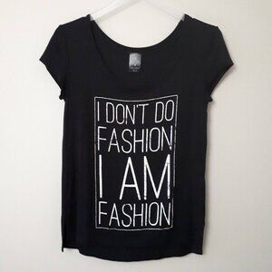 EUC Knit Riot black graphic text "I don't do fashion..." t-shirt, S