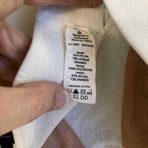 Size 32DD. Adjustable straps and eyelet hook closure. I'll say minor fade/wash wear piling just to be safe, but it's really in excellent shape.