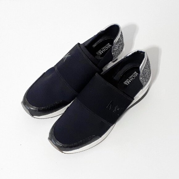 EUC MICHAEL Michael Kors black & white laceless logo sneaker w/ glitter accent 6