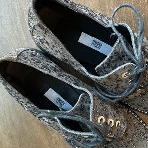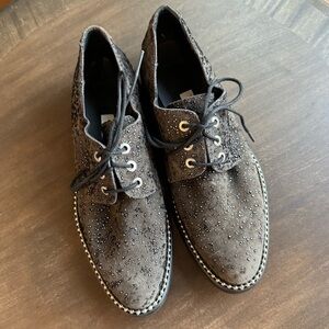 MIISTA London Adelaide Suede Oxford Brogues. Soft pewter pebbled suede upper and wrap around ball chain piping. Lace up with metal grommets. 1.5 block heel and 0.75” platform. Rubber sole. High quality shoes, made in Spain. Euro size 38 US size 7.5 These head turning shoes are in near new condition.
